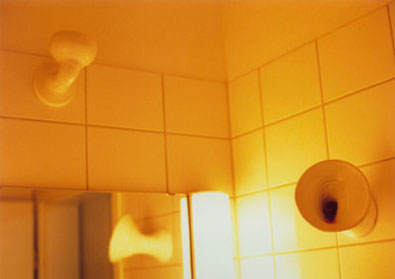 Luftpinsel - kleine, weiße, fleischfarbige Blüten wachsen aus den weißen Fliesen und malen Duftendes. Eine Gemeinschaftsinstallation mit meinem Kollegen Mathias Rosenbusch in den Toilettenräumen des Klosters Brunshausen. (1993) |