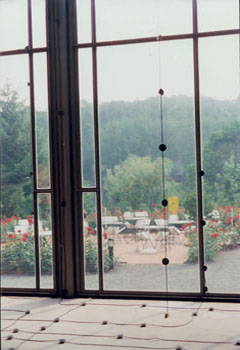 Wie ein Spinnennetz durchspannte ein Gebilde aus kleinen Lautsprechern und schwarzen Verbindungsfäden den warteraumähnlichen Vorraum zum Kloster Brunshausen. Geräusche öffentlichen Verkehrs durchkreuzten akustisch diese Räumlichkeiten. (1993) |