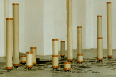 Bau einer körperhaften Ordnung - "eine elektronisch gesteuerte Lautsprecherskulptur, bestehend aus Röhren unterschiedlicher Länge und Anordnung. Sie erscheint beim ersten Hinschauen als zufälliges Resultat, offenbart sich bei längerer Konzentration als durchdachtes und ausgeklügeltes Konzept." (Homburg, Nr.221, Herr Kappler) (1994) |