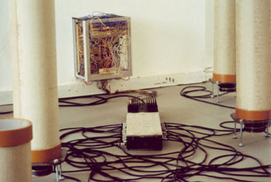 Bau einer körperhaften Ordnung - "eine elektronisch gesteuerte Lautsprecherskulptur, bestehend aus Röhren unterschiedlicher Länge und Anordnung. Sie erscheint beim ersten Hinschauen als zufälliges Resultat, offenbart sich bei längerer Konzentration als durchdachtes und ausgeklügeltes Konzept." (Homburg, Nr.221, Herr Kappler) (1994) |